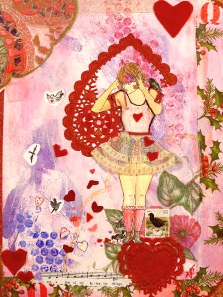 | | Mixed Media collage with watercolor, acrylics, metallic paint, pastels, tissues and handmade papers, doilies, decorative napkins, stamping, antique lace